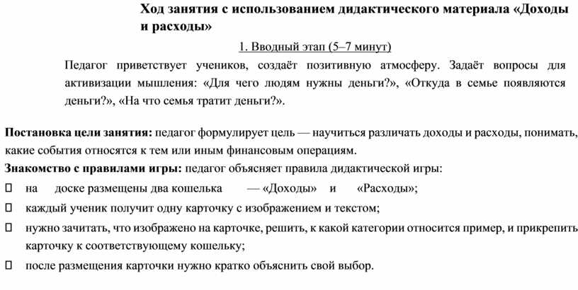 Постановка цели занятия: педагог формулирует цель — научиться различать доходы и расходы, понимать, какие события относятся к тем или иным финансовым операциям.