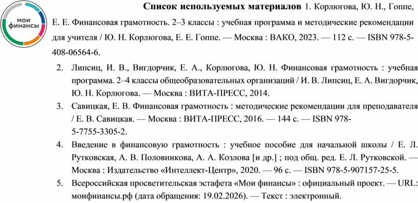 5. Всероссийская просветительская эстафета «Мои финансы» : официальный проект. — URL: моифинансы.рф (дата обращения: 19.02.2026). — Текст : электронный.