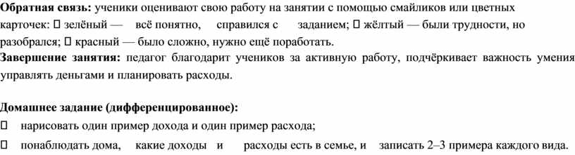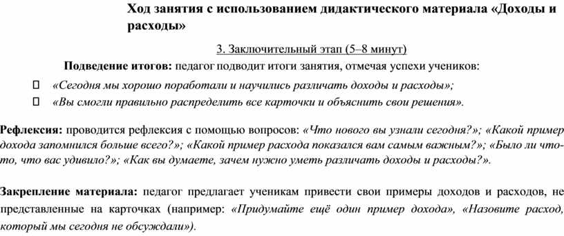 Рефлексия: проводится рефлексия с помощью вопросов: «Что нового вы узнали сегодня?»; «Какой пример дохода запомнился больше всего?»; «Какой пример расхода показался вам самым важным?»; «Было ли что-то, что вас удивило?»; «Как вы думаете, зачем нужно уметь различать доходы и расходы?».