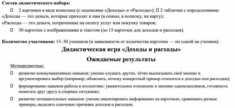 - развитие коммуникативных навыков: умение слушать других, чётко высказывать своё мнение и аргументировать выбор (например, объяснять, почему конкретный пример относится к доходам или расходам);