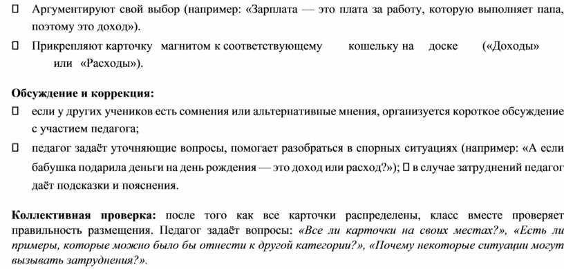 Коллективная проверка: после того как все карточки распределены, класс вместе проверяет правильность размещения. Педагог задаёт вопросы: «Все ли карточки на своих местах?», «Есть ли примеры, которые можно было бы отнести к другой категории?», «Почему некоторые ситуации могут вызывать затруднения?».