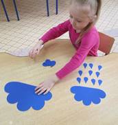 Материал: две фигурки - тучки одинакового цвета, но разные по размеру; фигурки капелек большого и маленького размеров одинакового цвета.