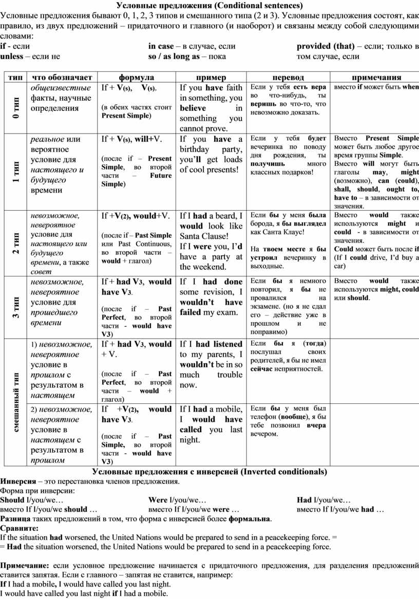 Условные предложения бывают 0, 1, 2, 3 типов и смешанного типа (2 и 3). Условные предложения состоят, как правило, из двух предложений – придаточного и главного (и наоборот) и связаны между собой следующими словами: