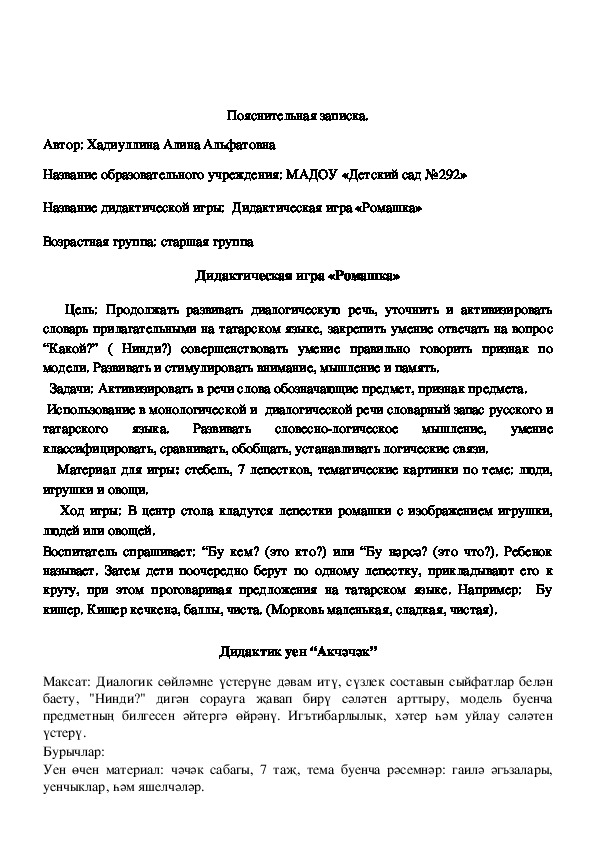 Воспитатель спрашивает: “Бу кем? (это кто?) или “Бу нәрсә? (это что?). Ребенок называет. Затем дети поочередно берут по одному лепестку, прикладывают его к кругу, при этом проговаривая предложения на татарском языке. Например: Бу кишер. Кишер кечкенә, баллы, чиста. (Морковь маленькая, сладкая, чистая).