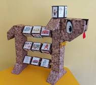 У собаки на голове цилиндр, на котором расположены карточки с профессиями и три ряда подвижных кубиков. Ребёнок выбирает карточку с профессией и составляет рассказ по схеме: