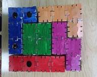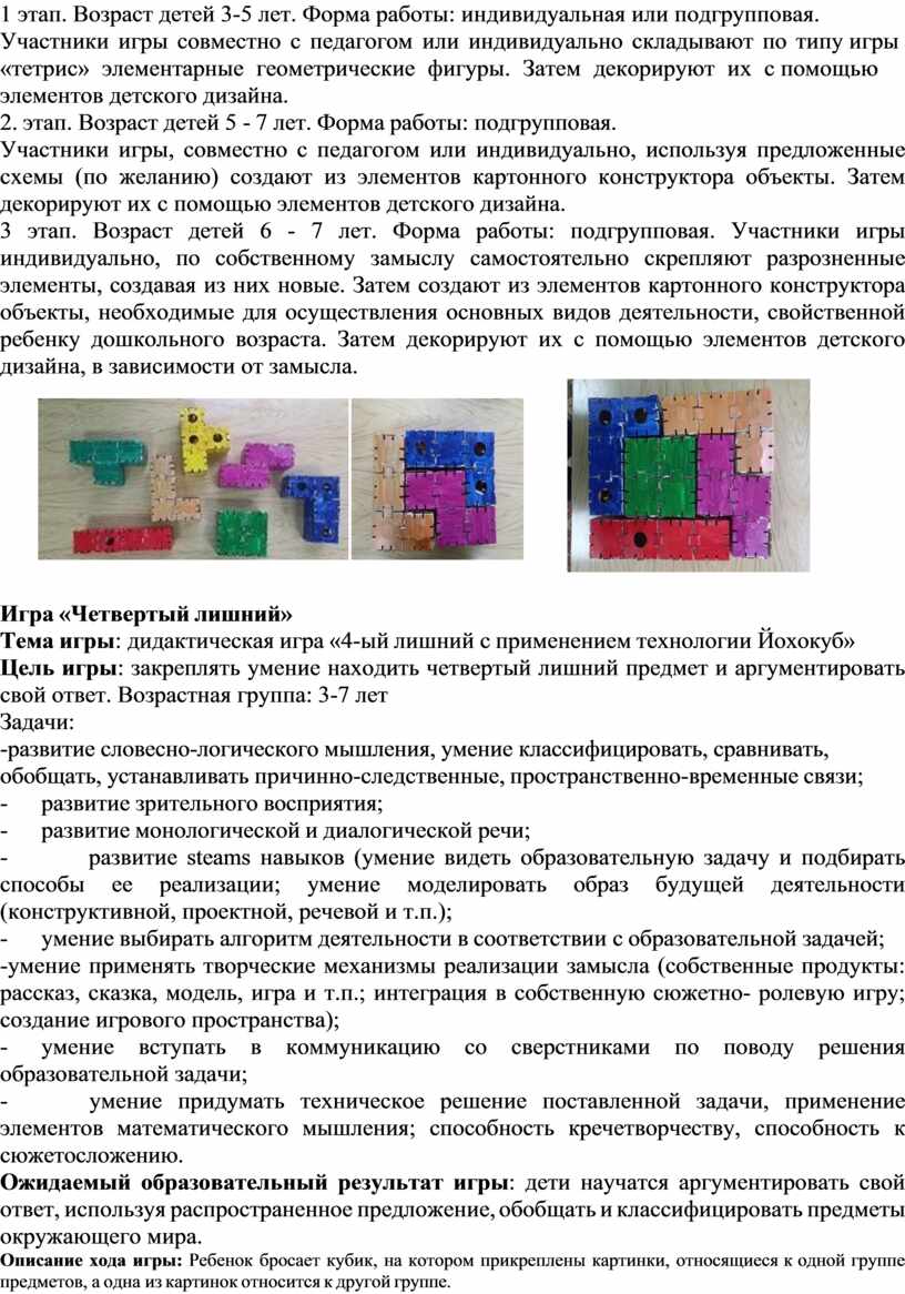 Для игры дети, с помощью педагога, сконструировали и изготовили детали. Детям было предложено сначала из плоских геометрических фигу(4шт.) выложить варианты геометрических фигур, затем повторить это с Йохокубиками. Когда возможные комбинации были получены, кубы соединили скобами и раскрасили.
