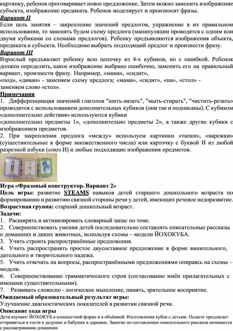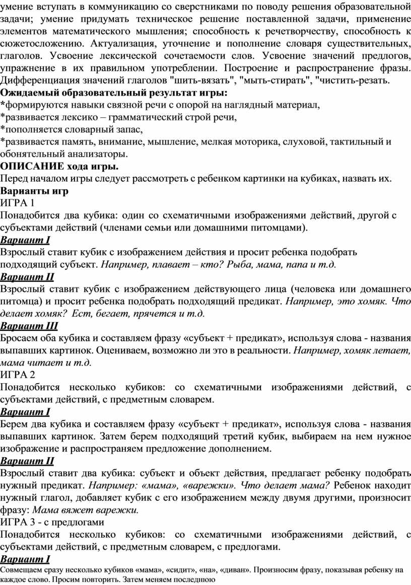 Взрослый ставит два кубика: субъект и объект действия, предлагает ребенку подобрать нужный предикат. Например: «мама», «варежки». Что делает мама? Ребенок находит нужный глагол, добавляет кубик с его изображением между двумя другими, произносит фразу: Мама вяжет варежки.
