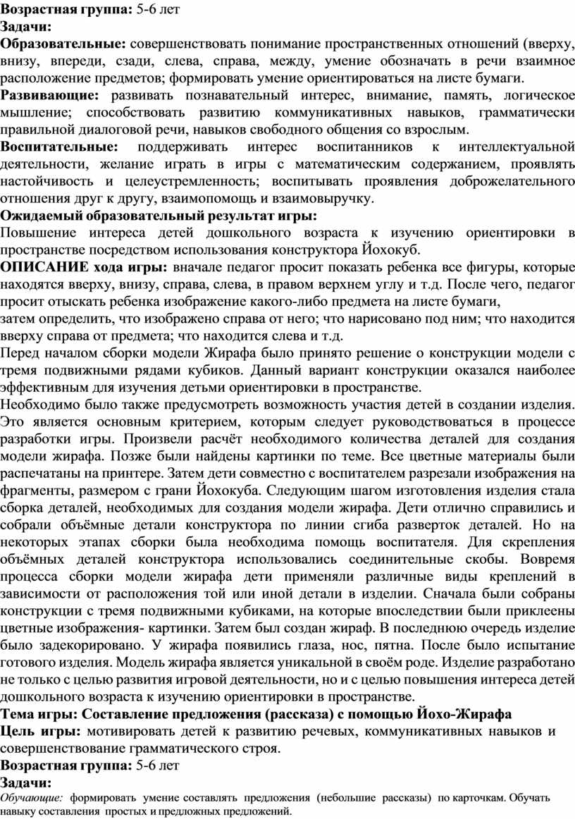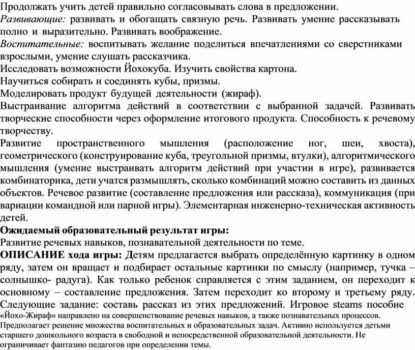 «Йохо-Жираф» направлено на совершенствование речевых навыков, а также познавательных процессов. Предполагает решение множества воспитательных и образовательных задач. Активно используется детьми старшего дошкольного возраста в свободной и непосредственной образовательной деятельности. Не ограничивает фантазию педагогов при определении темы.