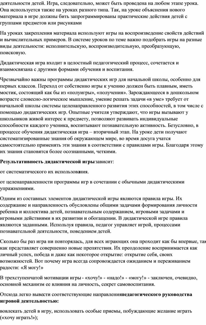 Чрезвычайно важны программы дидактических игр для начальной школы, особенно для первых классов. Переход от собственно игры к учению должен быть плавным, иметь мостик, состоящий как бы из «полуигры», «получения». Зарождающееся в дошкольном возрасте словесно-логическое мышление, умение решать задачи «в уме» требует от начальной школы системы целенаправленного развития этих способностей, в том числе с помощью дидактических игр. Опытные учителя утверждают, что игры вызывают у школьников живой интерес к предмету, позволяют развивать индивидуальные способности каждого ученика, воспитывают познавательную активность. Безусловно, в процессе обучения дидактическая игра – вторичный этап. На уроке дети получают систематизированные знания об окружающем мире, во время досуга учатся самостоятельно применять эти знания в соответствии с правилами игры. Благодаря этому их знания становятся более осознанными, четкими.