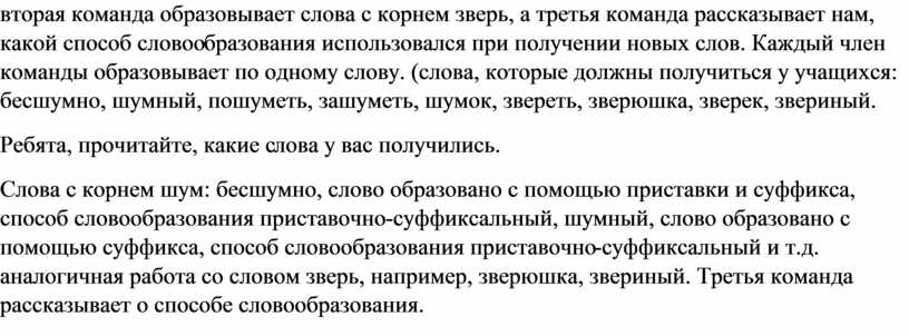 Слова с корнем шум: бесшумно, слово образовано с помощью приставки и суффикса, способ словообразования приставочно-суффиксальный, шумный, слово образовано с помощью суффикса, способ словообразования приставочно-суффиксальный и т.д. аналогичная работа со словом зверь, например, зверюшка, звериный. Третья команда рассказывает о способе словообразования.