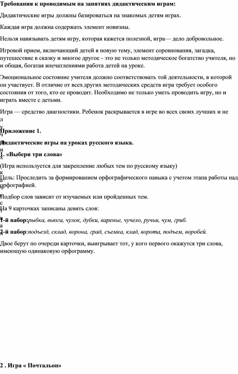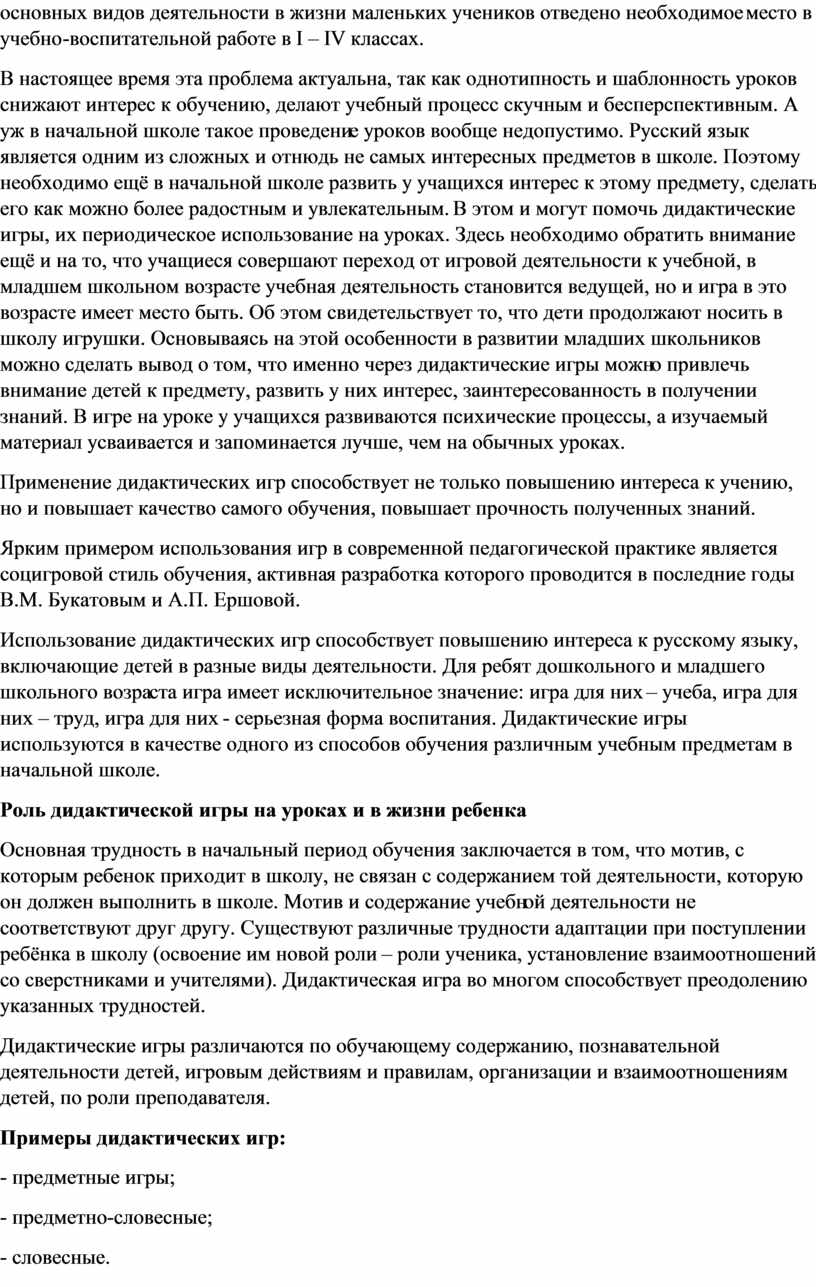 Использование дидактических игр способствует повышению интереса к русскому языку, включающие детей в разные виды деятельности. Для ребят дошкольного и младшего школьного возраста игра имеет исключительное значение: игра для них – учеба, игра для них – труд, игра для них - серьезная форма воспитания. Дидактические игры используются в качестве одного из способов обучения различным учебным предметам в начальной школе.