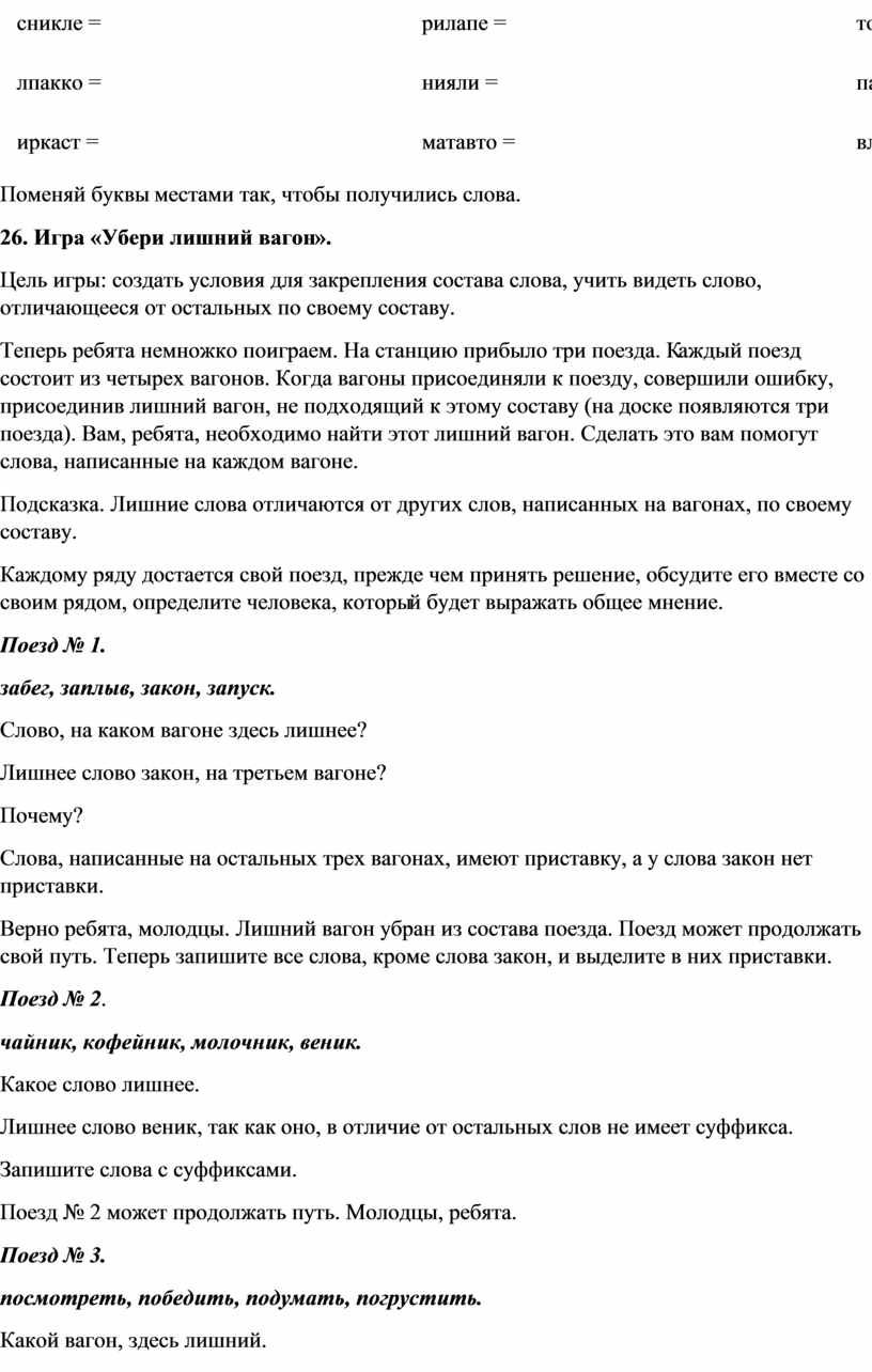Каждому ряду было предложено убрать лишний вагончик из своего поезда. Таким образом, учащиеся разделились на три команды. Задачей учащихся было найти слово, которое является лишним среди всех остальных. Для этого им необходимо было вспомнить состав слова, разобрать каждое слово по составу, затем, сравнив состав всех слов, найти лишнее слово, отличающееся от остальных слов по составу.