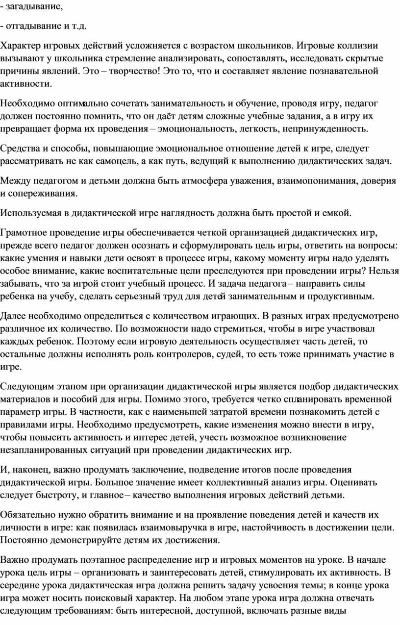 Для развития и совершенствования познавательных, умственных и творческих способностей детей очень действенным методом является дидактическая игра, которая может выступать как ведущая деятельность до старшей школы. Игре как одному из основных видов деятельности в жизни маленьких учеников отведено необходимое место в учебно-воспитательной работе в I – IV классах.