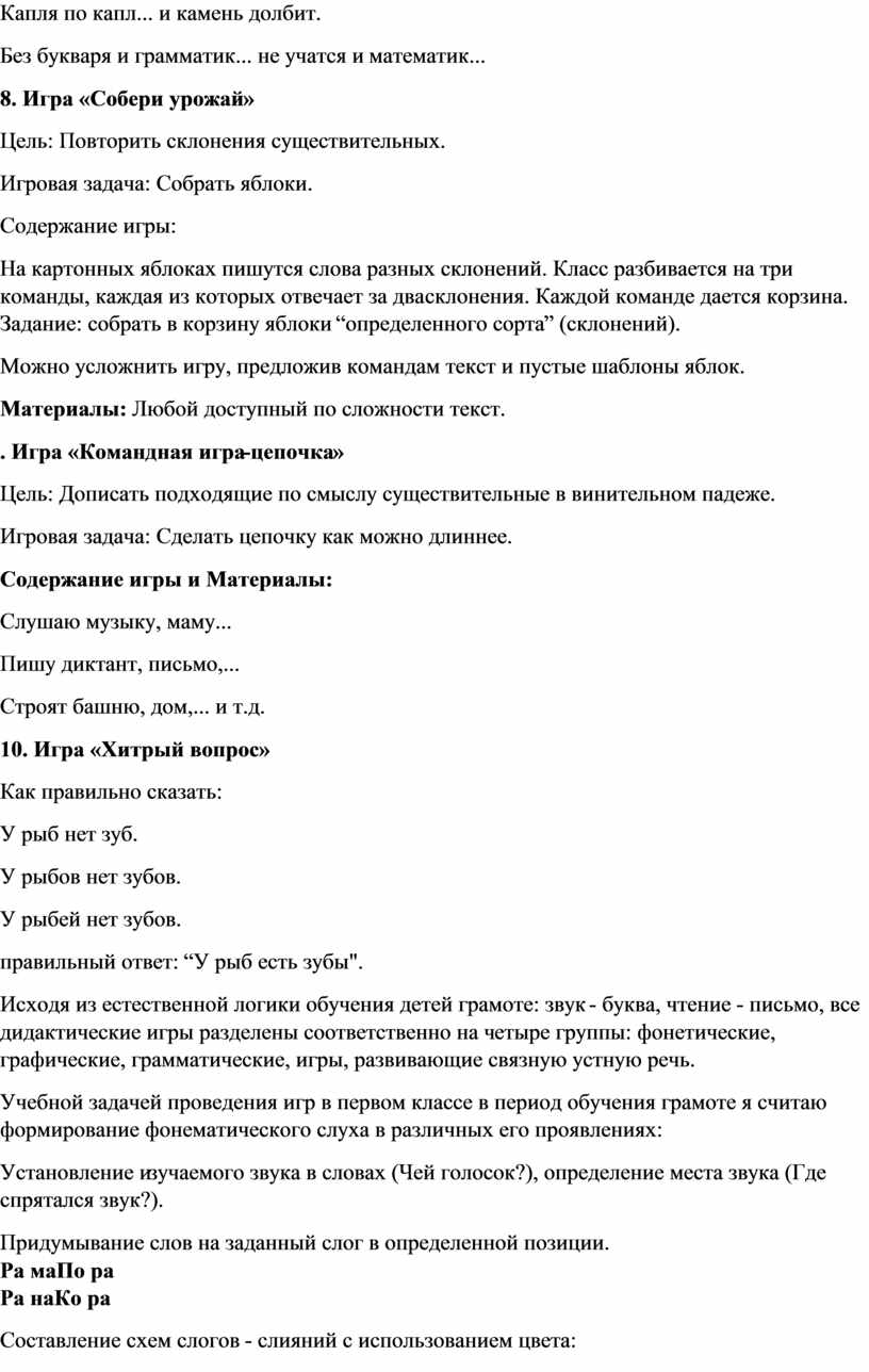 Ведь то, что игра – это часть учебного процесса, ни для кого не секрет. Игра помогает формированию фонематического восприятия слова, обогащает ребенка новыми сведениями, активирует мыслительную деятельность, внимание, а главное - стимулирует речь. В результате чего у детей появляется интерес к русскому языку. Не говоря уже о том, что дидактические игры по русскому языку способствуют формированию орфографической зоркости младшего школьника.