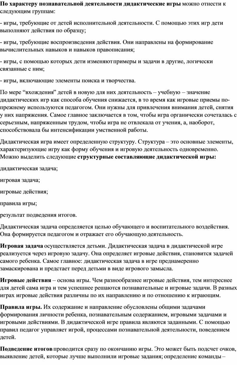 Такая группировка игр подчеркивает их направленность на обучение, познавательную деятельность детей, но не раскрывает в достаточной мере основы дидактической игры — особенностей игровой деятельности детей, игровых задач, игровых действий и правил, организацию жизни детей, руководство воспитателя.