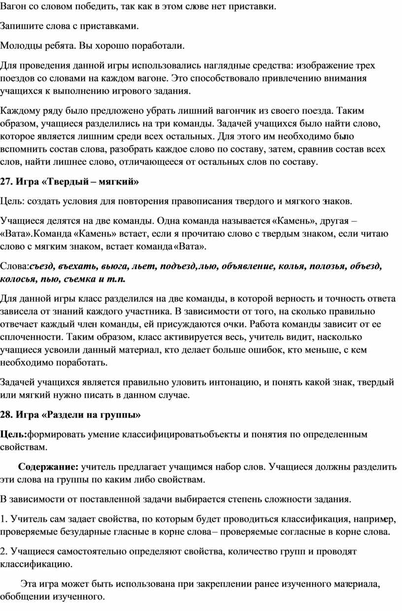 Для проведения данной игры использовались наглядные средства: изображение трех поездов со словами на каждом вагоне. Это способствовало привлечению внимания учащихся к выполнению игрового задания.
