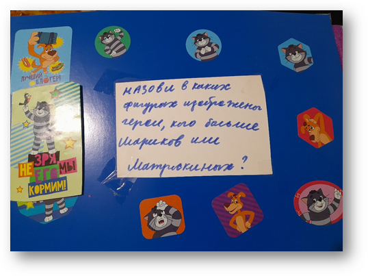 «Назови в каких геометрических фигурах изображены герои мультфильма. Кого из них больше Шариков или Матроскиных?»