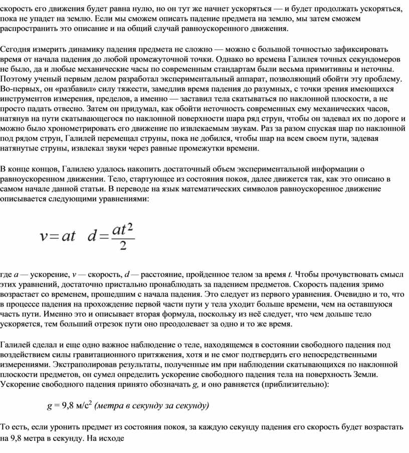 При постоянном ускорении скорость физического тела равномерно возрастает, начиная с нуля. Расстояние, пройденное равноускоренным телом, начиная с нулевой скорости, пропорционально квадрату времени. |