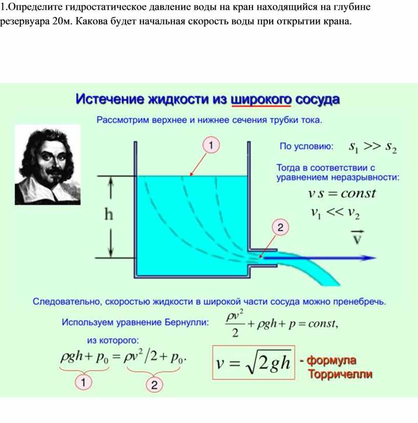 1.Определите гидростатическое давление воды на кран находящийся на глубине резервуара 20м. Какова будет начальная скорость воды при открытии крана.