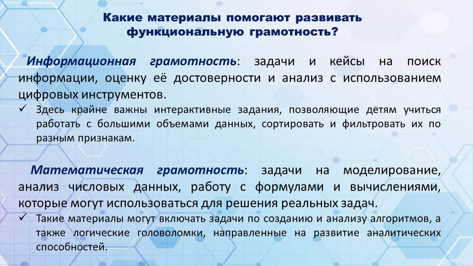 для формирования функциональной грамотности (информационной, математической, финансовой, читательской и др.)