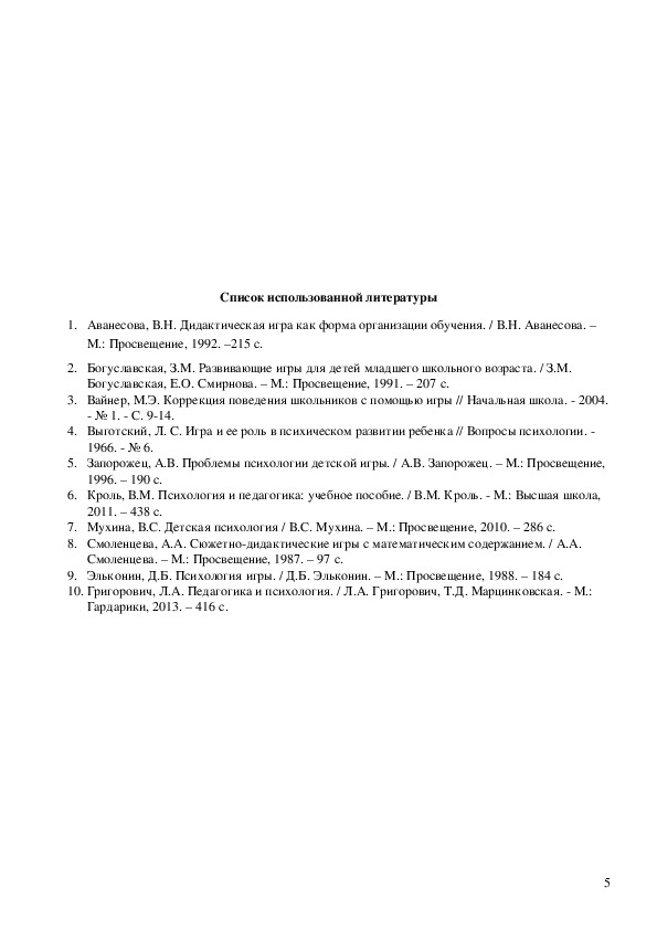 5. Запорожец, А.В. Проблемы психологии детской игры. / А.В. Запорожец. – М.: Просвещение,