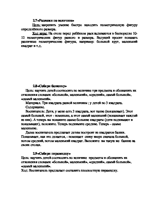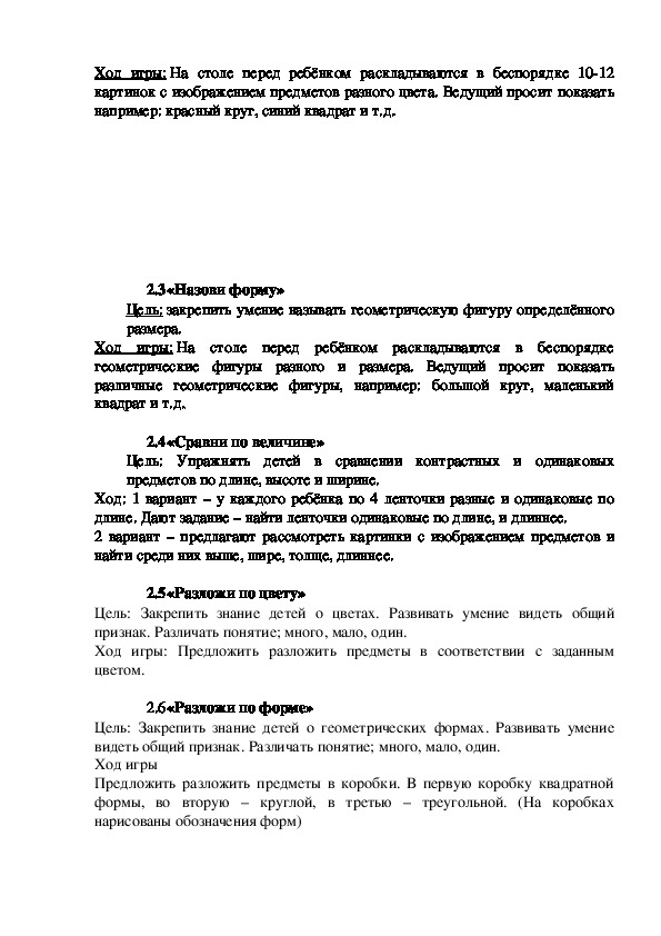 Ход игры: На столе перед ребёнком раскладываются в беспорядке 10-12 геометрических фигур разного и размера. Ведущий просит показать различные геометрические фигуры, например: большой круг, маленький квадрат и т.д.
