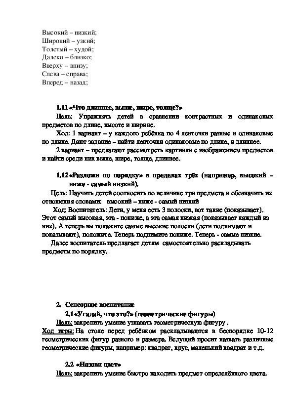 Цель: Упражнять детей в сравнении контрастных и одинаковых предметов по длине, высоте и ширине.