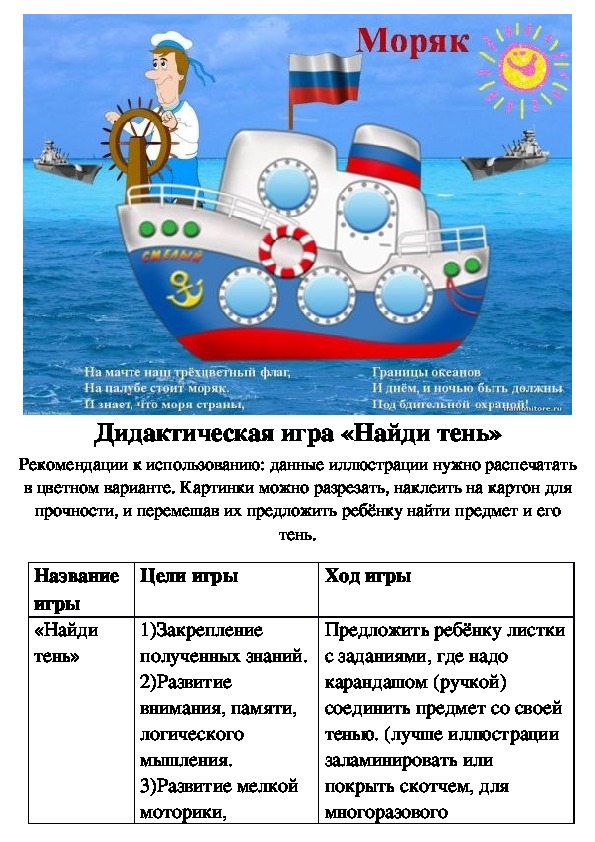 Как известно, результативнее всего обучение и развитие детей происходит в игре. Дидактические игры способствуют развитию у детей, внимания, памяти, воображения, мышления, обогащению словарного запаса закрепляют пройденный материал и т. д . Предлагаем Вашему вниманию небольшую подборку игр по тематическому периоду «Дню защитника Отечества». Для удобства в использовании игры размещены в таблице. Также рекомендуется распечатать иллюстрации в цветном варианте, наклеить их на картон или покрыть скотчем для прочности. Вёсёлых игр!