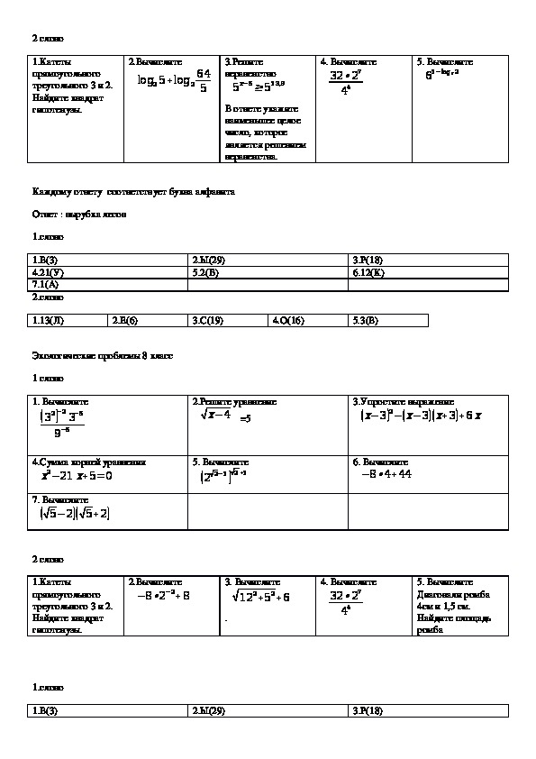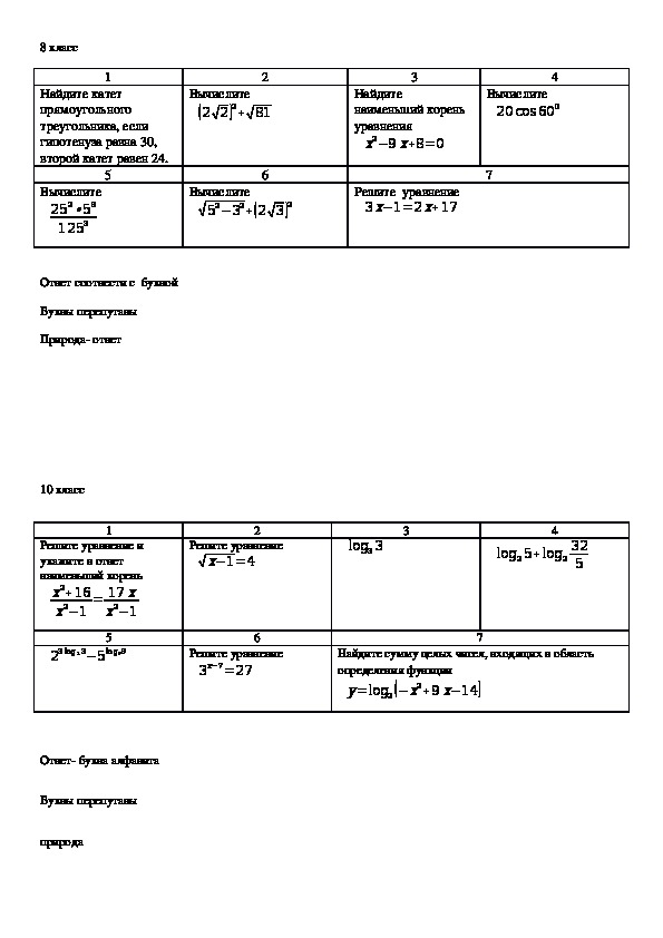 2017 год- год Экологии. Данные дидактические материалы предназначены для систематизации знаний учащихся 8 класса и 10 классов по математике.В результате учащиеся получают слово , связанное с экологией.Задания комбинированнные, те включают задания из курса алгебры и геометрии. Кроме этого при выполнении заданий учащиеся вспоминают русский алфавит