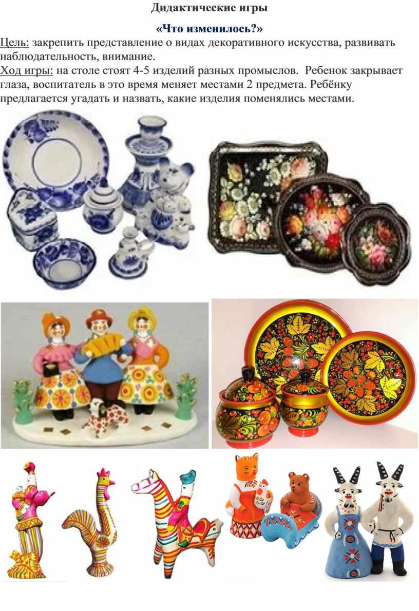 Ход игры: на столе стоят 4-5 изделий разных промыслов. Ребенок закрывает глаза, воспитатель в это время меняет местами 2 предмета. Ребёнку предлагается угадать и назвать, какие изделия поменялись местами.