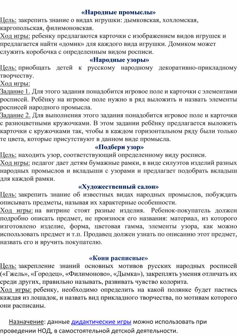 Ход игры: педагог дает детям бумажные рамки, в виде силуэтов изделий разных народных промыслов и вкладыши с узорами и предлагает подобрать вкладыш для каждой рамки.