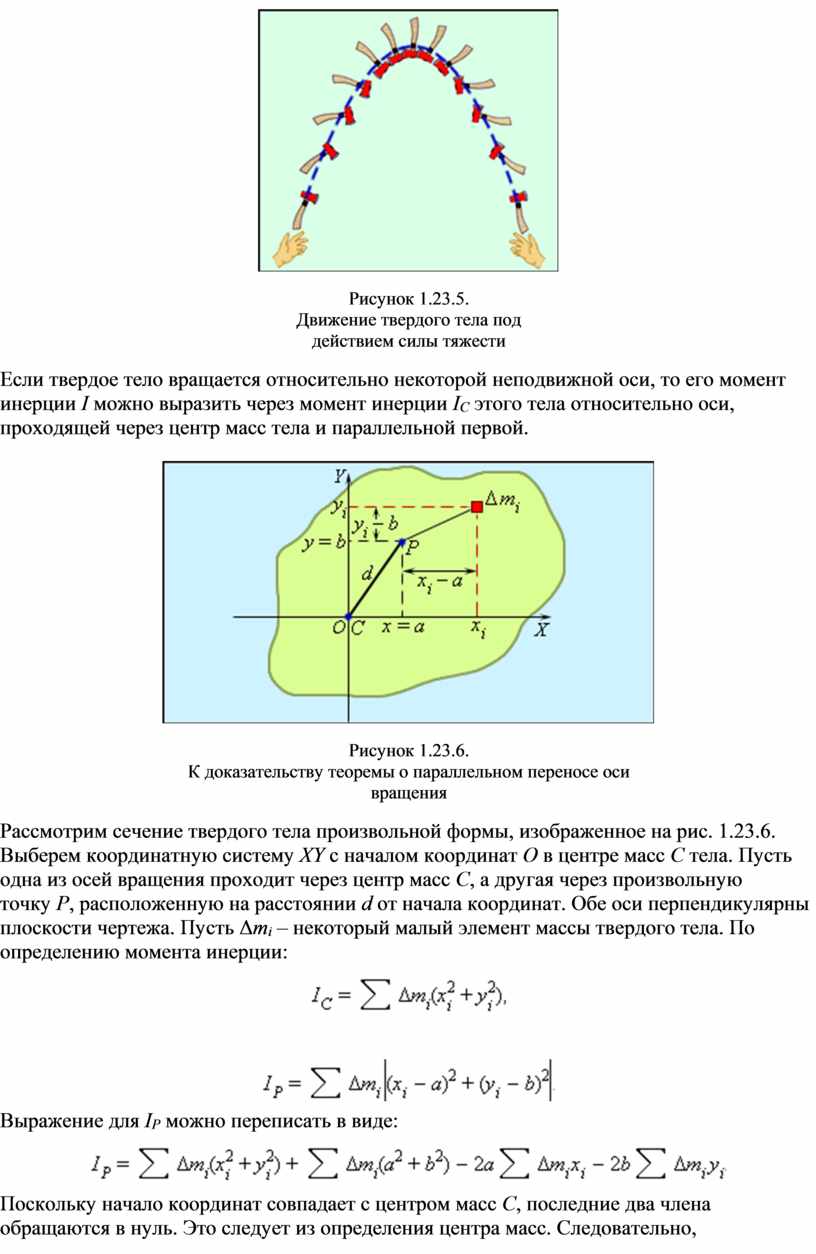 Рассмотрим сечение твердого тела произвольной формы, изображенное на рис. 1.23.6. Выберем координатную систему XY с началом координат O в центре масс C тела. Пусть одна из осей вращения проходит через центр масс C, а другая через произвольную точку P, расположенную на расстоянии d от начала координат. Обе оси перпендикулярны плоскости чертежа. Пусть Δmi – некоторый малый элемент массы твердого тела. По определению момента инерции: