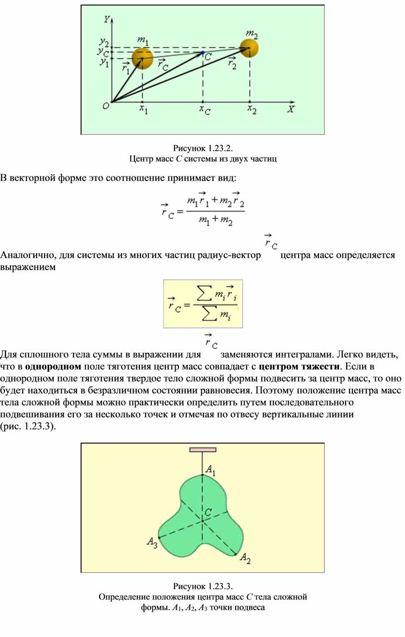 Во многих задачах рассматривается случай, когда ось вращения твердого тела проходит через его центр массы. Положение xC, yC центра масс для простого случая системы из двух частиц с массами m1 и m2, расположенными в плоскости XY в точках с координатами x1, y1 и x2, y2 (рис. 1.23.2), определяется выражениями: