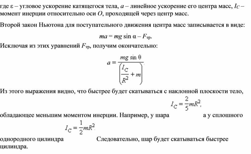 где ε – угловое ускорение катящегося тела, a – линейное ускорение его центра масс, IC – момент инерции относительно оси O, проходящей через центр масс.