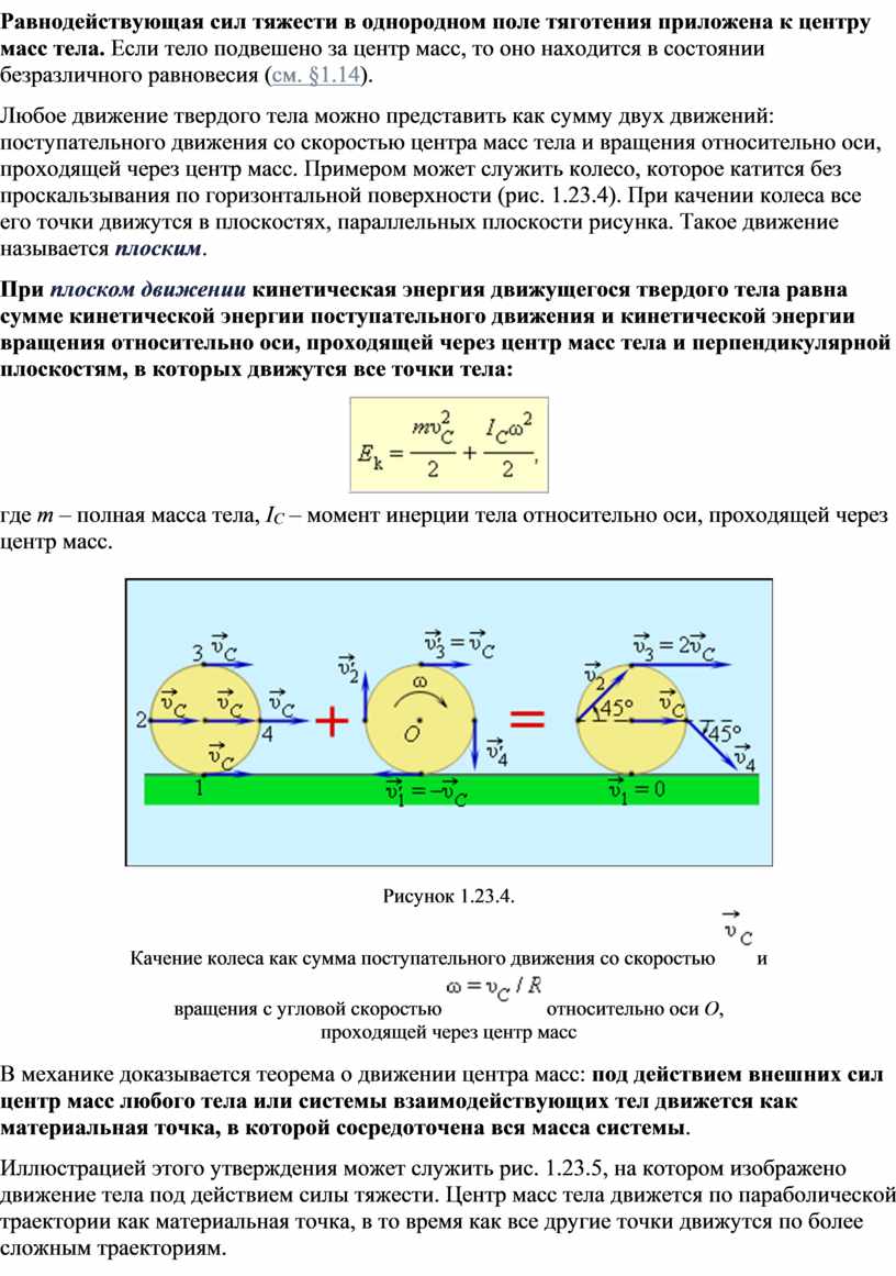 Иллюстрацией этого утверждения может служить рис. 1.23.5, на котором изображено движение тела под действием силы тяжести. Центр масс тела движется по параболической траектории как материальная точка, в то время как все другие точки движутся по более сложным траекториям.