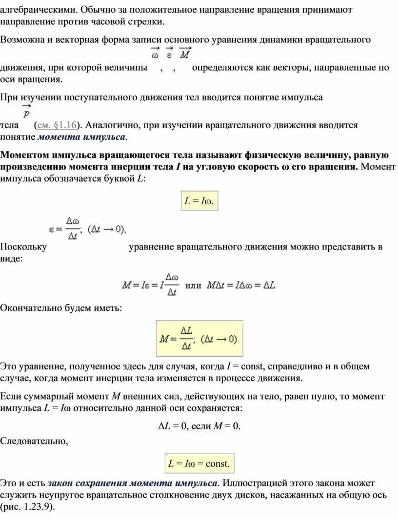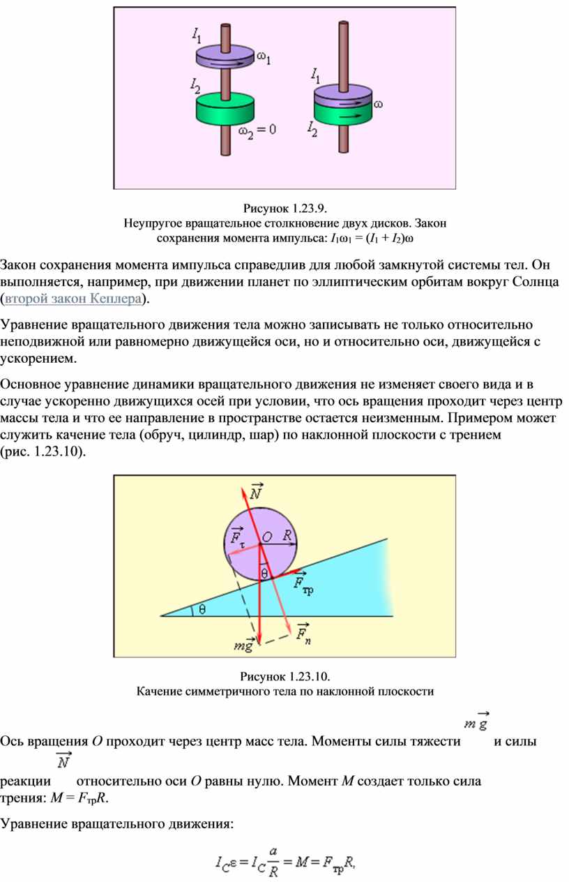 Это и есть закон сохранения момента импульса. Иллюстрацией этого закона может служить неупругое вращательное столкновение двух дисков, насажанных на общую ось (рис. 1.23.9).