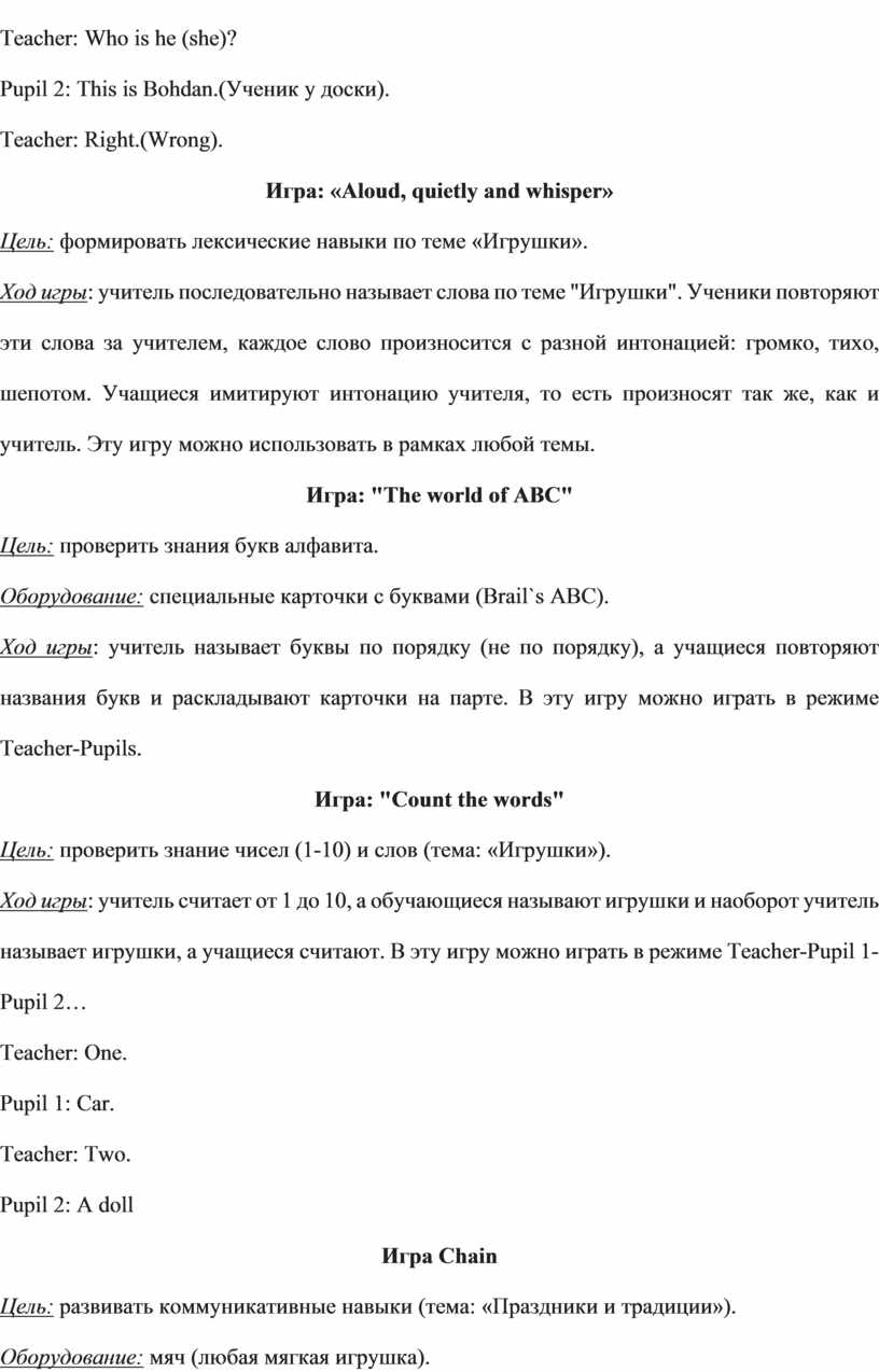 Ход игры: учитель последовательно называет слова по теме "Игрушки". Ученики повторяют эти слова за учителем, каждое слово произносится с разной интонацией: громко, тихо, шепотом. Учащиеся имитируют интонацию учителя, то есть произносят так же, как и учитель. Эту игру можно использовать в рамках любой темы.