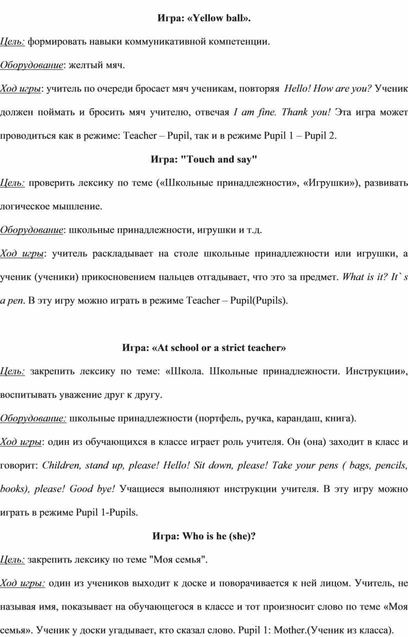 Игровая деятельность является ведущей для детей младшего возраста. На уроке иностранного языка рекомендуем использовать следующие игры: