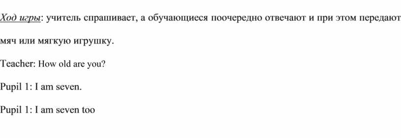 Ход игры: учитель по очереди бросает мяч ученикам, повторяя Hello! How are you? Ученик должен поймать и бросить мяч учителю, отвечая I am fine. Thank you! Эта игра может проводиться как в режиме: Teacher – Pupil, так и в режиме Pupil 1 – Pupil 2.