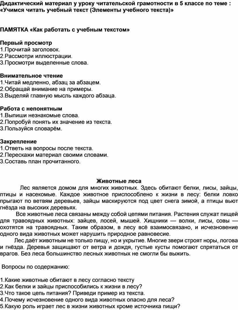 Дидактический материал у уроку читательской грамотности в 5 классе по теме : «Учимся читать учебный текст (Элементы учебного текста)»