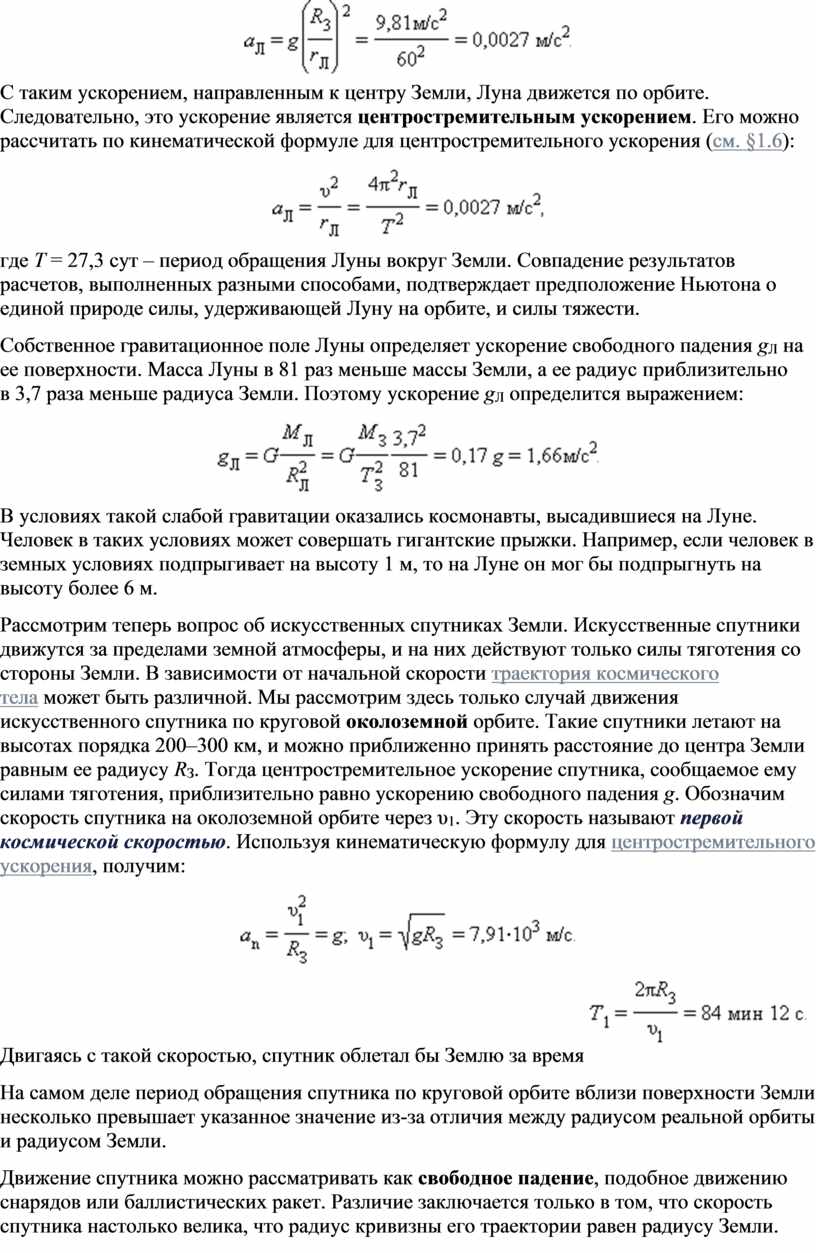 С таким ускорением, направленным к центру Земли, Луна движется по орбите. Следовательно, это ускорение является центростремительным ускорением. Его можно рассчитать по кинематической формуле для центростремительного ускорения (см. §1.6):