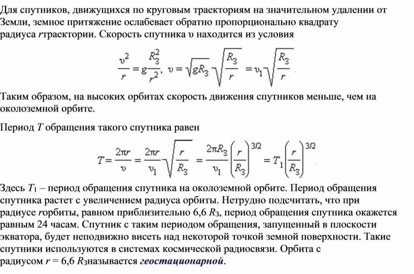 Для спутников, движущихся по круговым траекториям на значительном удалении от Земли, земное притяжение ослабевает обратно пропорционально квадрату радиуса rтраектории. Скорость спутника υ находится из условия