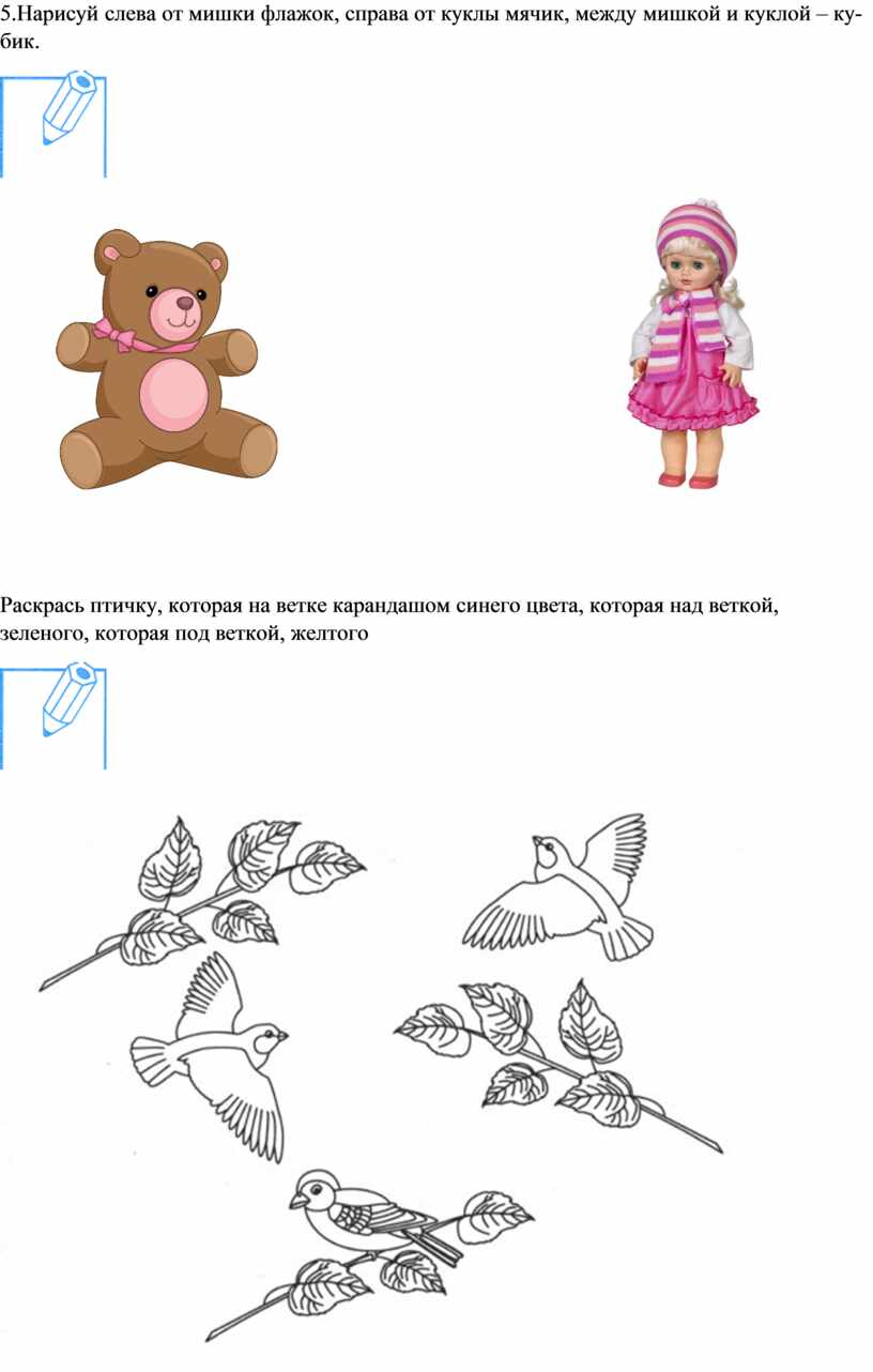 5.Нарисуй слева от мишки флажок, справа от куклы мячик, между мишкой и куклой – кубик.