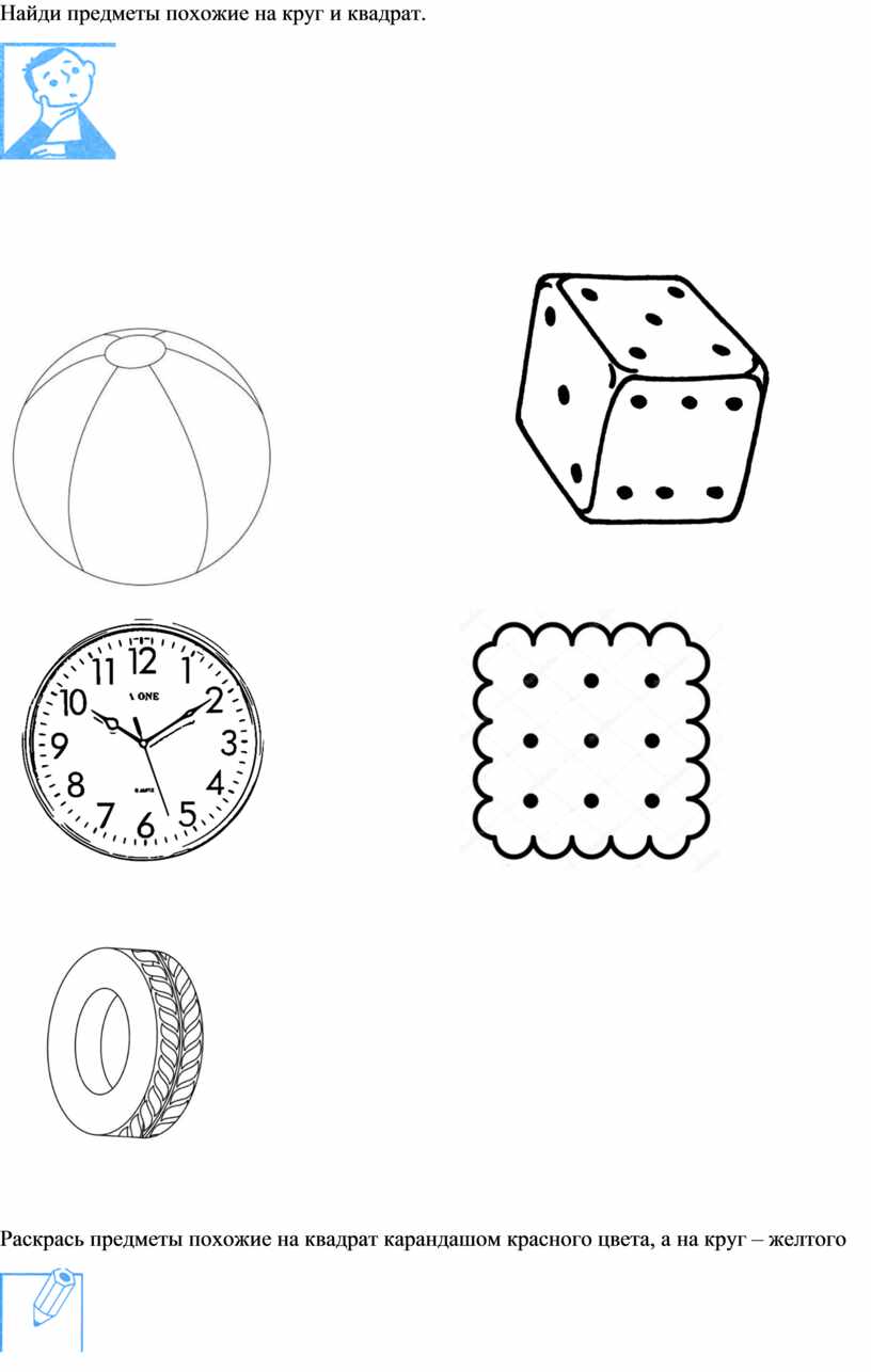 Раскрась предметы похожие на квадрат карандашом красного цвета, а на круг – желтого