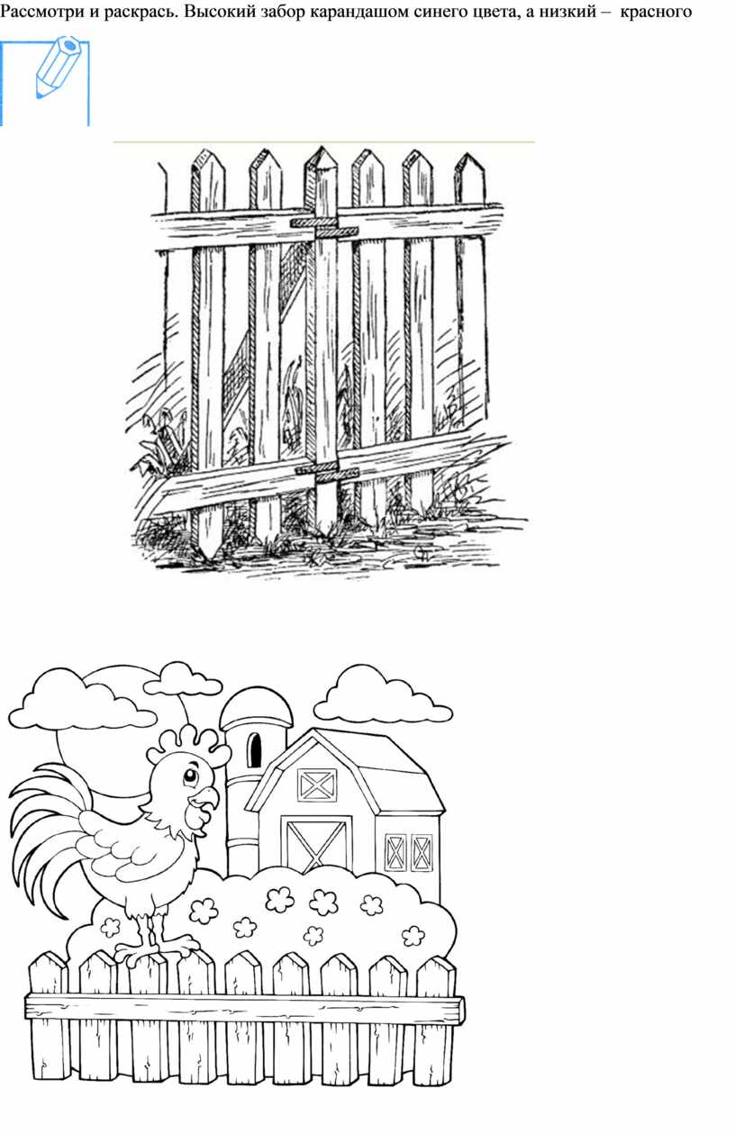 Рассмотри и раскрась. Высокий забор карандашом синего цвета, а низкий – красного
