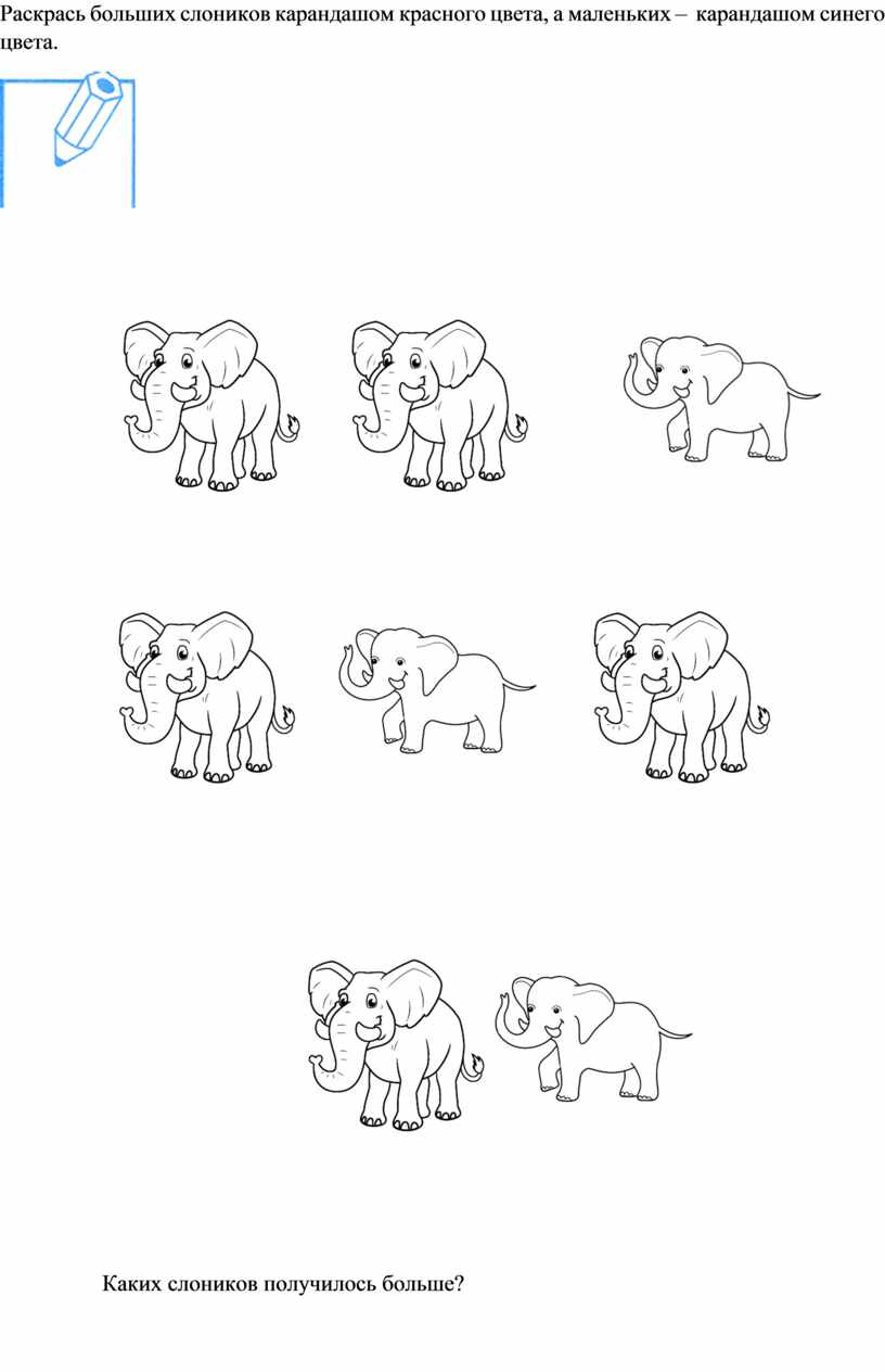 Раскрась больших слоников карандашом красного цвета, а маленьких – карандашом синего цвета.