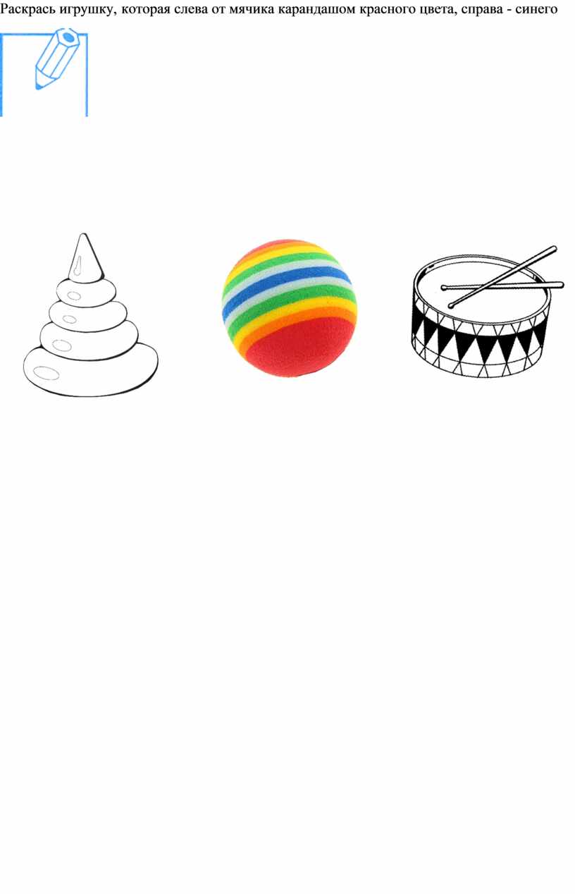 Раскрась игрушку, которая слева от мячика карандашом красного цвета, справа - синего