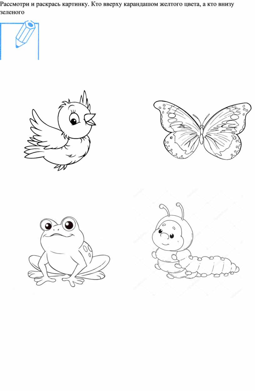 Рассмотри и раскрась картинку. Кто вверху карандашом желтого цвета, а кто внизу зеленого