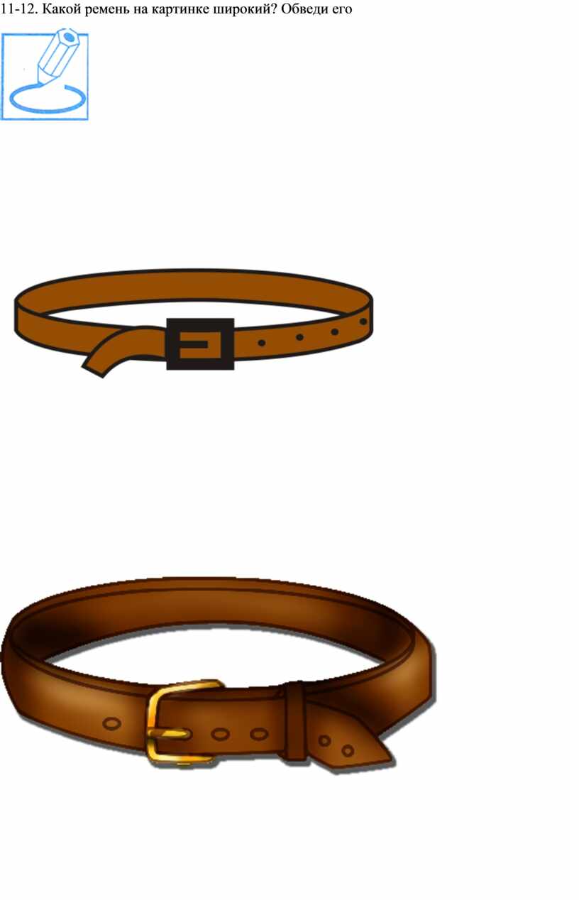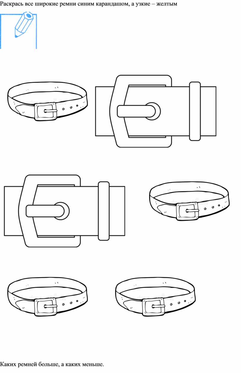 Раскрась все широкие ремни синим карандашом, а узкие – желтым