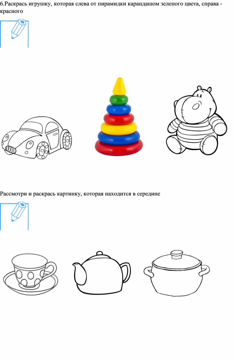 6.Раскрась игрушку, которая слева от пирамидки карандашом зеленого цвета, справа - красного
